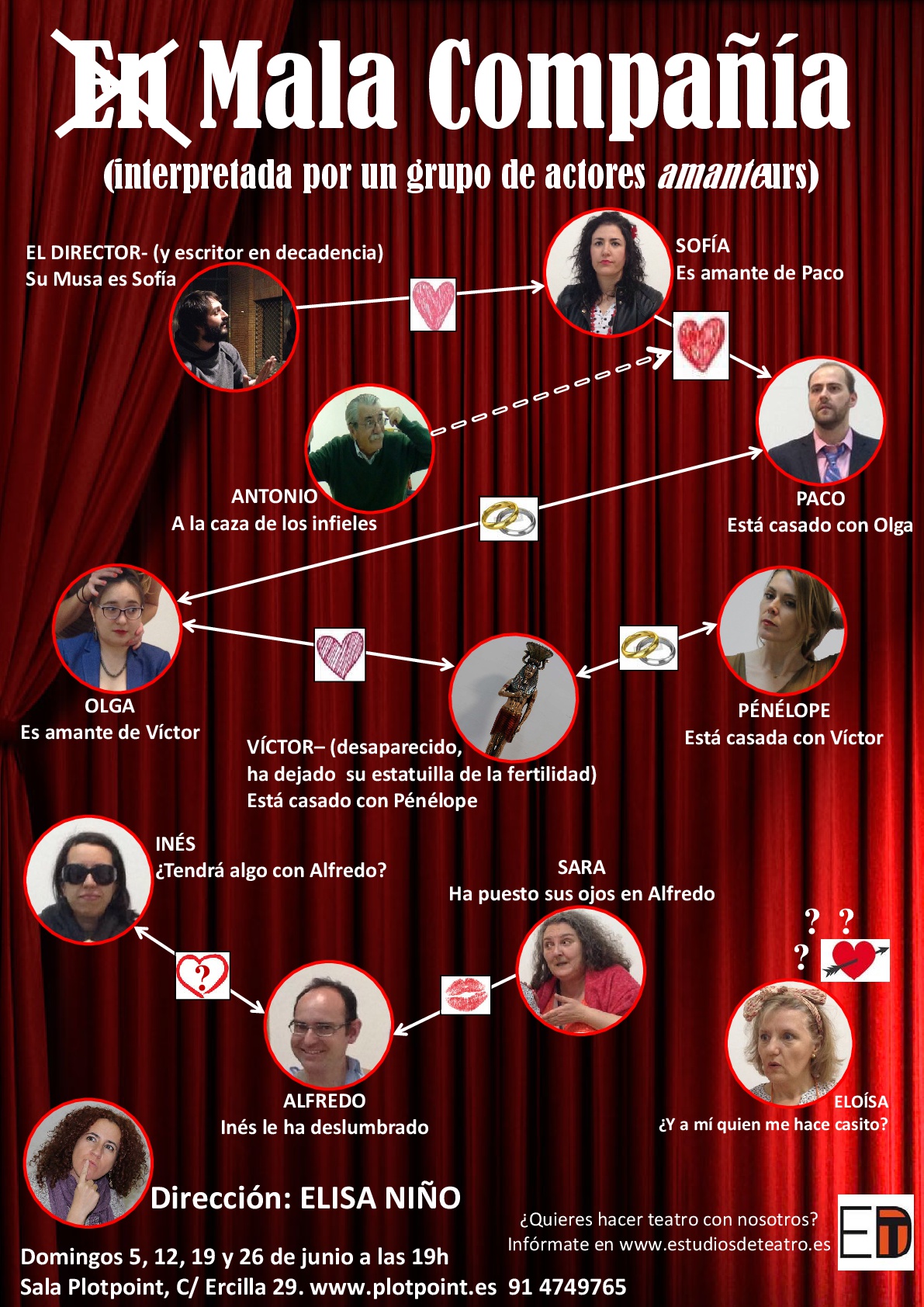 El grupo de teatro “avanzado y creación de montaje“ presenta su espectáculo “En Mala Compañía”. Podéis vernos todos los domingos de Junio a las 19h en la Sala Plotpoint, en la Calle Ercilla 29.